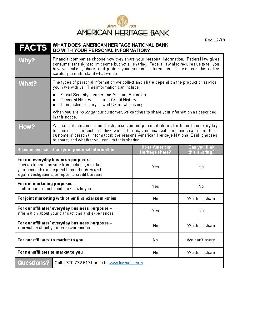 . There are several different ways to get a hold of us at American Heritage Bank. Youre always welcome to stop in and see us at one of our locations or you can always give us a call. Be aware of phishing phone calls text messages or emails that may ask you to provide your American Heritage Online Teller account information or debitcredit card information such as.